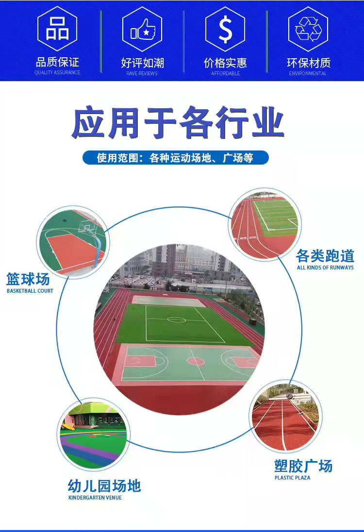 2、全天候使用:不管什么季节及温差,均能维持高水准的品质,雨后更能立即使用,增加利用时间,提高场地使用率;